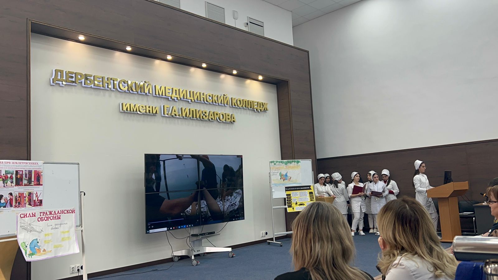 В актовом зале собралисьперсонал и студенты медицинского колледжа.