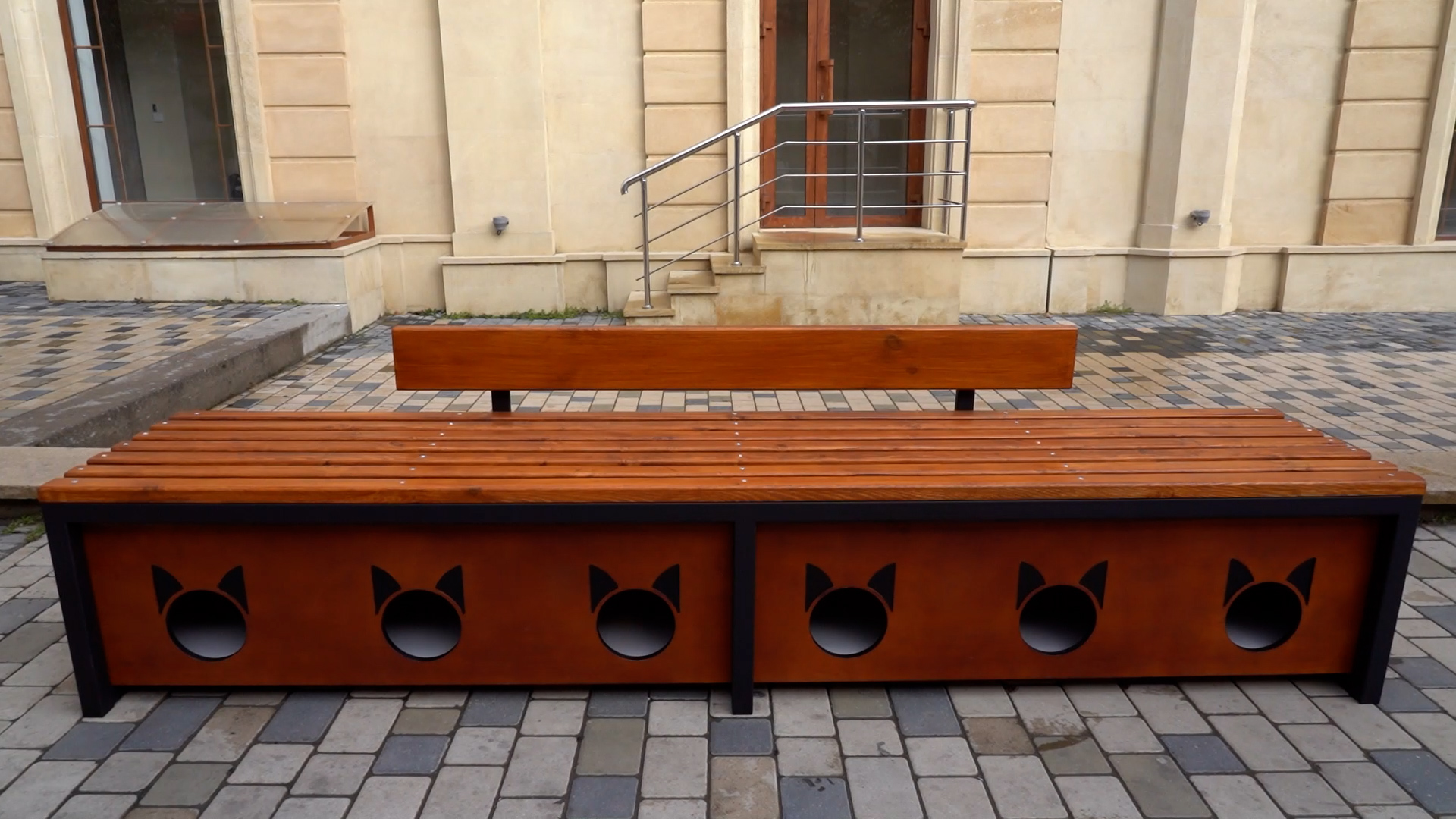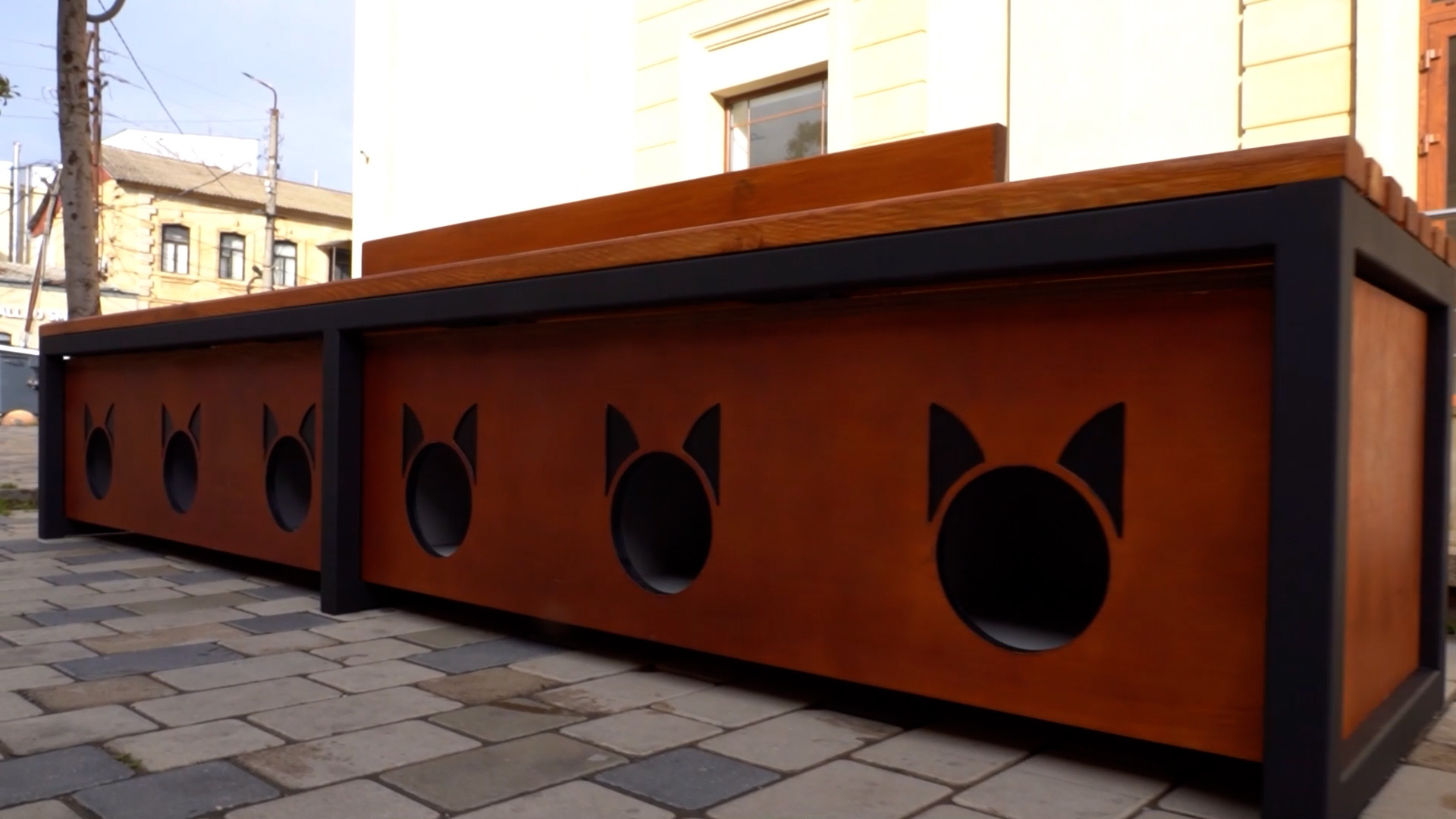 Конструкция представляет собой скамью-тумбу, под которой размещены шесть отдельных утеплённых домика. В каждом из них могут одновременно укрыться две-три кошки, что особенно актуально в холодный период года.