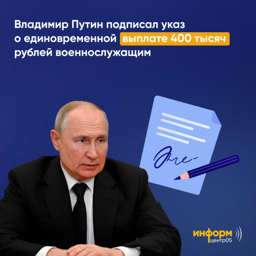 Владимир Путин подписал указ о единовременной выплате 400 тыс. руб. военнослужащим, которые заключат контракт с 1 августа и до 31 декабря для службы в зоне СВО